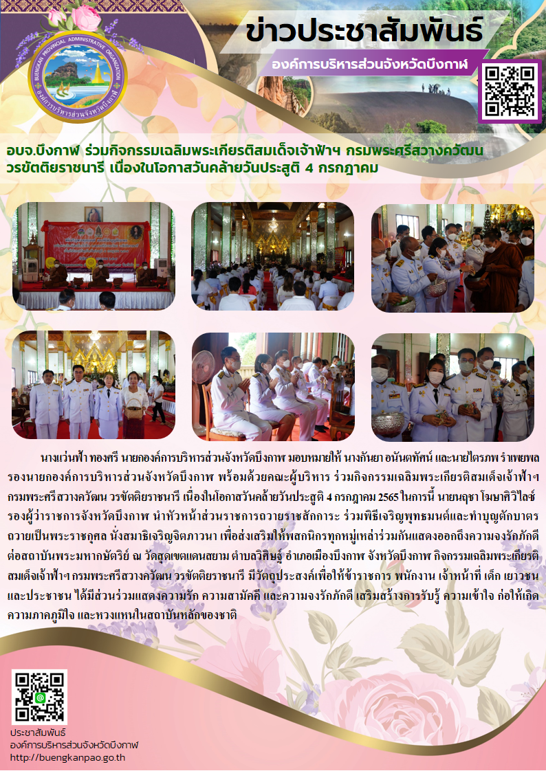 อบจ.บึงกาฬ ร่วมกิจกรรมเฉลิมพระเกียรติสมเด็จเจ้าฟ้าฯ กรมพระศรีสวางควัฒน วรขัตติยราชนารี เนื่องในโอกาสวันคล้ายวันประสูติ 4 กรกฎาคม