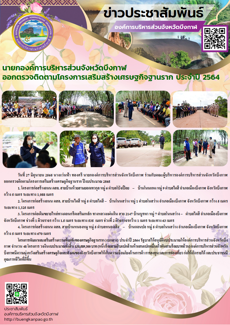 นายกองค์การบริหารส่วนจังหวัดบึงกาฬ ออกตรวจติดตามโครงการเสริมสร้างเศรษฐกิจฐานราก ประจำปี 2564