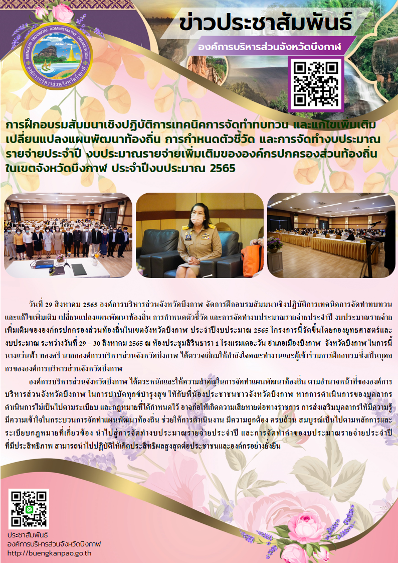 การฝึกอบรมสัมมนาเชิงปฏิบัติการเทคนิคการจัดทำทบทวน และแก้ไขเพิ่มเติม เปลี่ยนแปลงแผนพัฒนาท้องถิ่น การกำหนดตัวชี้วัด และการจัดทำงบประมาณรายจ่ายประจำปี งบประมาณรายจ่ายเพิ่มเติมขององค์กรปกครองส่วนท้องถิ่นในเขตจังหวัดบึงกาฬ ประจำปีงบประมาณ 2565