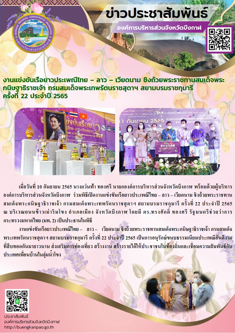 งานแข่งขันเรือยาวประเพณีไทย – ลาว – เวียดนาม ชิงถ้วยพระราชทานสมเด็จพระกนิษฐาธิราชเจ้า กรมสมเด็จพระเทพรัตนราชสุดาฯ สยามบรมราชกุมารี ครั้งที่ 22 ประจำปี 2565