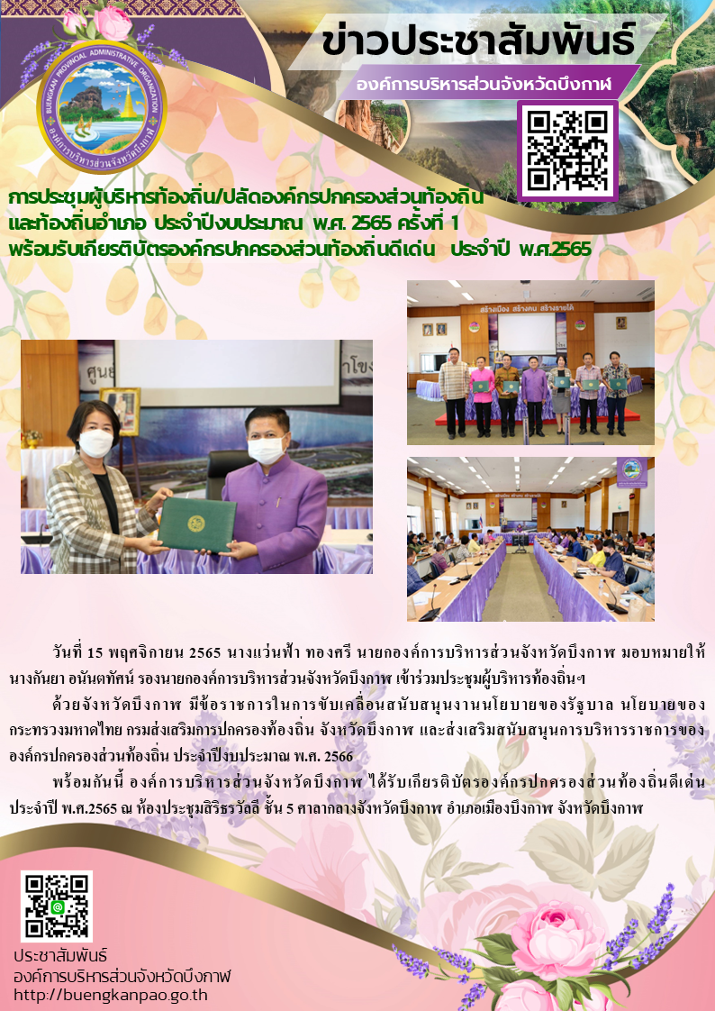 การประชุมผู้บริหารท้องถิ่น/ปลัดองค์กรปกครองส่วนท้องถิ่น และท้องถิ่นอำเภอประจำปีงบประมาณ พ.ศ. 2565 ครั้งที่ 1 พร้อมรับเกียรติบัตรองค์กรปกครองส่วนท้องถิ่นดีเด่น ประจำปี พ.ศ.2565