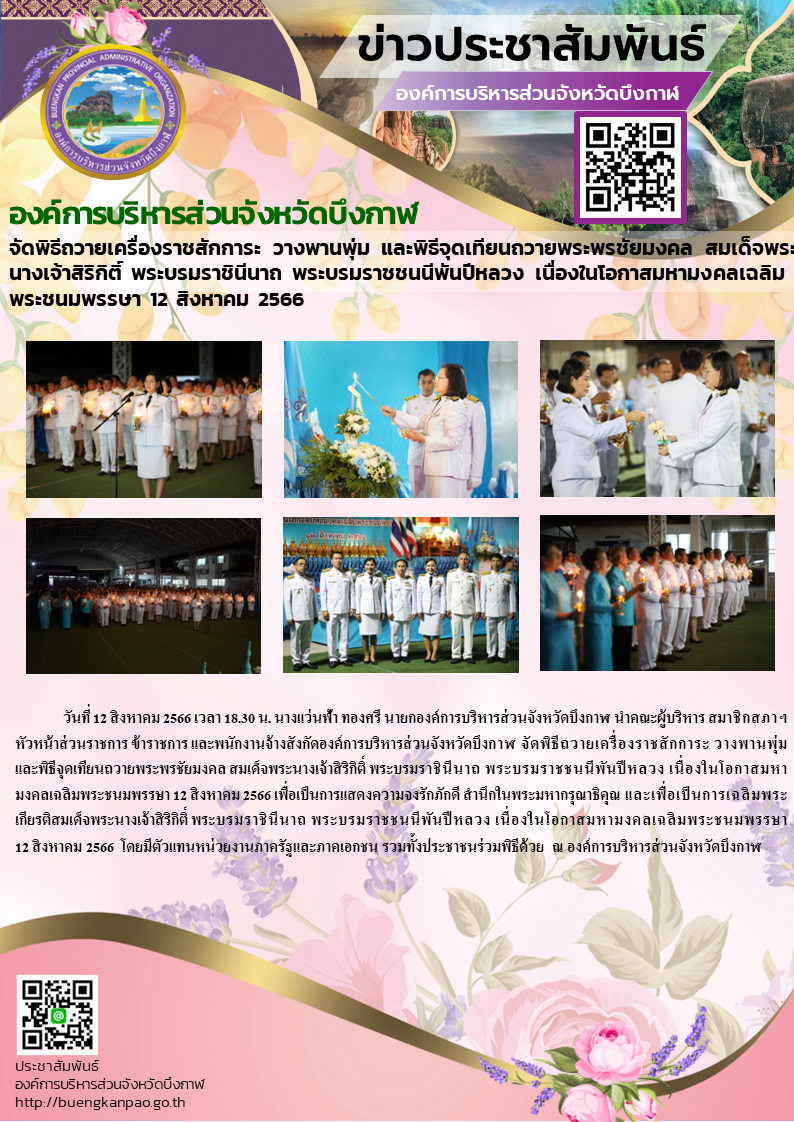 องค์การบริหารส่วนจังหวัดบึงกาฬ จัดพิธีถวายเครื่องราชสักการะ วางพานพุ่ม และพิธีจุดเทียนถวายพระพรชัยมงคล สมเด็จพระนางเจ้าสิริกิติ์ พระบรมราชินีนาถ พระบรมราชชนนีพันปีหลวง เนื่องในโอกาสมหามงคลเฉลิมพระชนมพรรษา 12 สิงหาคม 2566