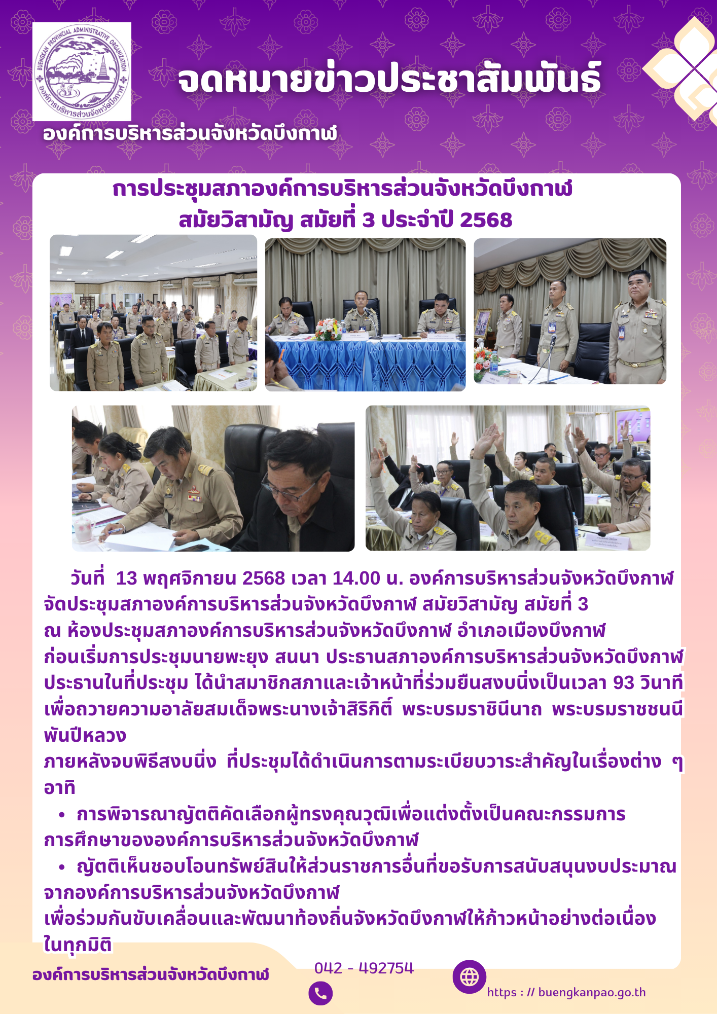 การประชุมสภาองค์การบริหารส่วนจังหวัดบึงกาฬ สมัยวิสามัญ สมัยที่ 3 ประจำปี 2568