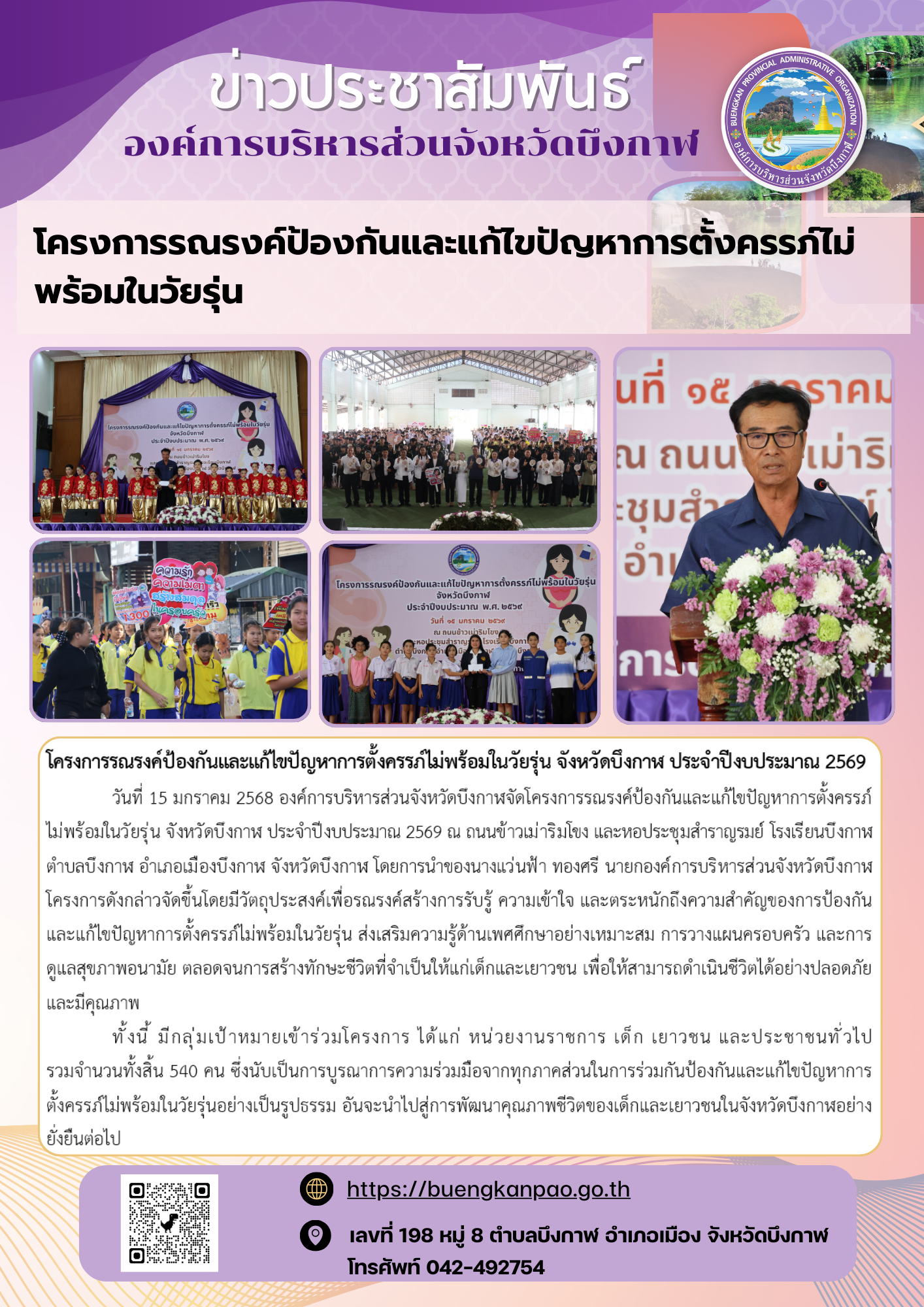 โครงการรณรงค์ป้องกันและแก้ไขปัญหาการตั้งครรภ์ไม่พร้อมในวัยรุ่น จังหวัดบึงกาฬ ประจำปีงบประมาณ 2569