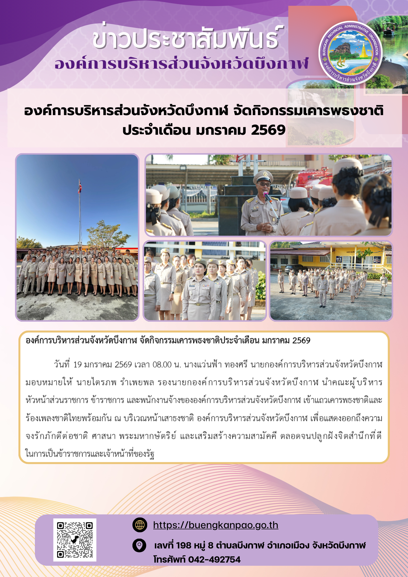 องค์การบริหารส่วนจังหวัดบึงกาฬ จัดกิจกรรมเคารพธงชาติประจำเดือน มกราคม 2569