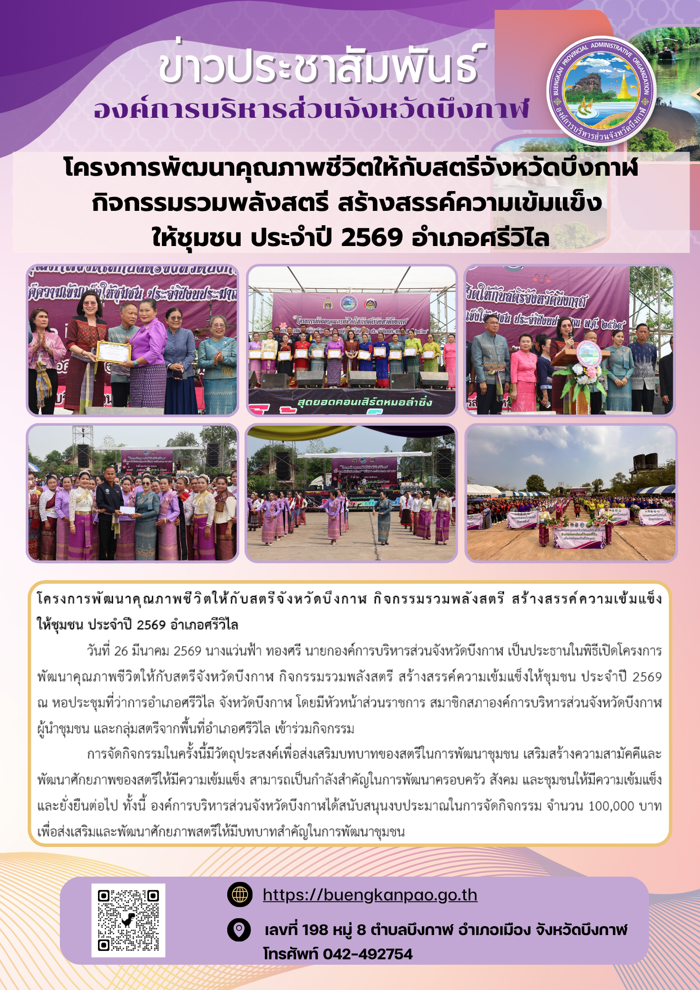 โครงการพัฒนาคุณภาพชีวิตให้กับสตรีจังหวัดบึงกาฬ กิจกรรมรวมพลังสตรี สร้างสรรค์ความเข้มแข็งให้ชุมชน ประจำปี 2569 อำเภอศรีวิไล