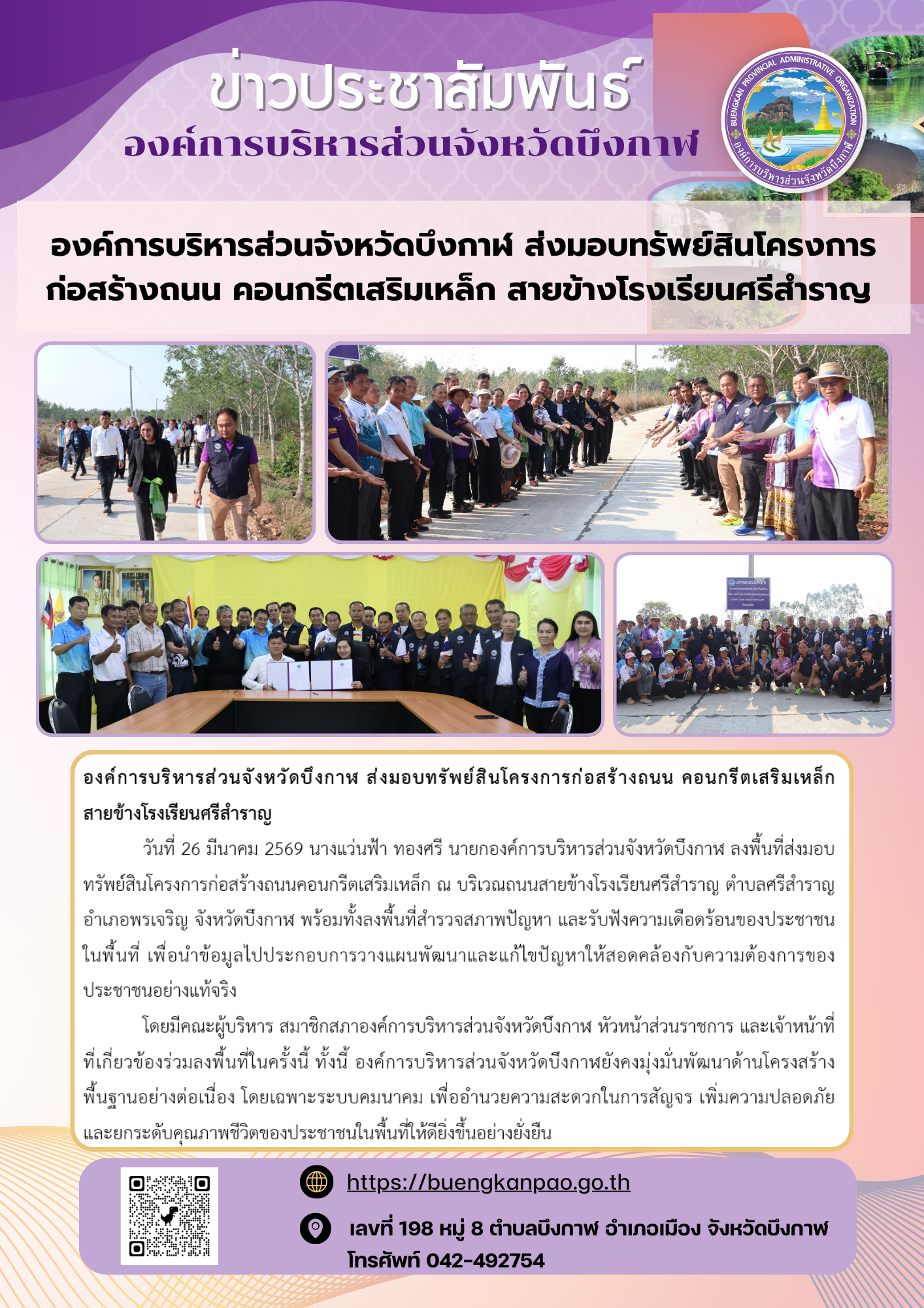 องค์การบริหารส่วนจังหวัดบึงกาฬ ส่งมอบทรัพย์สินโครงการก่อสร้างถนน คอนกรีตเสริมเหล็ก สายข้างโรงเรียนศรีสำราญ