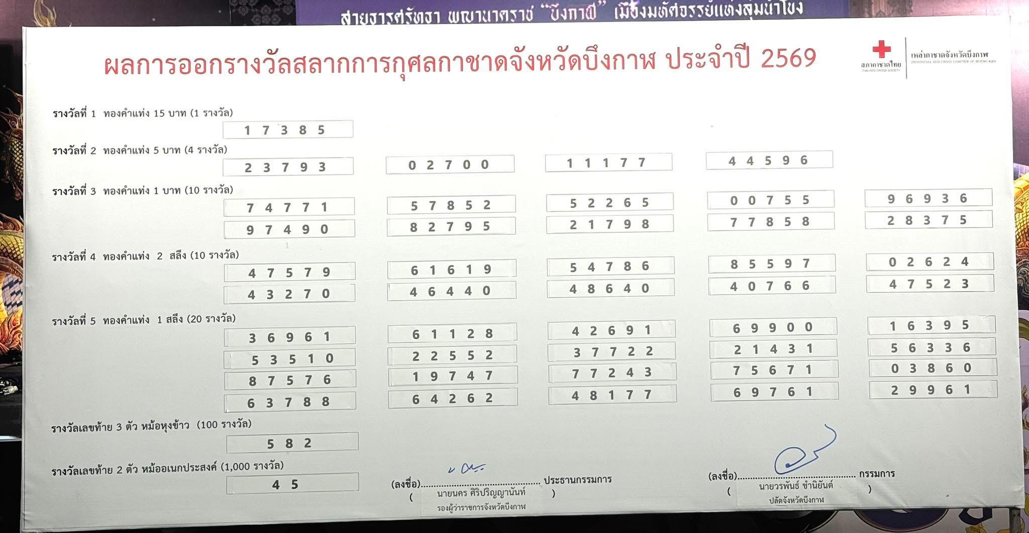 ผลการออกรางวัลสลากการกุศลกาชาดจังหวัดบึงกาฬ ประจำปี 2569