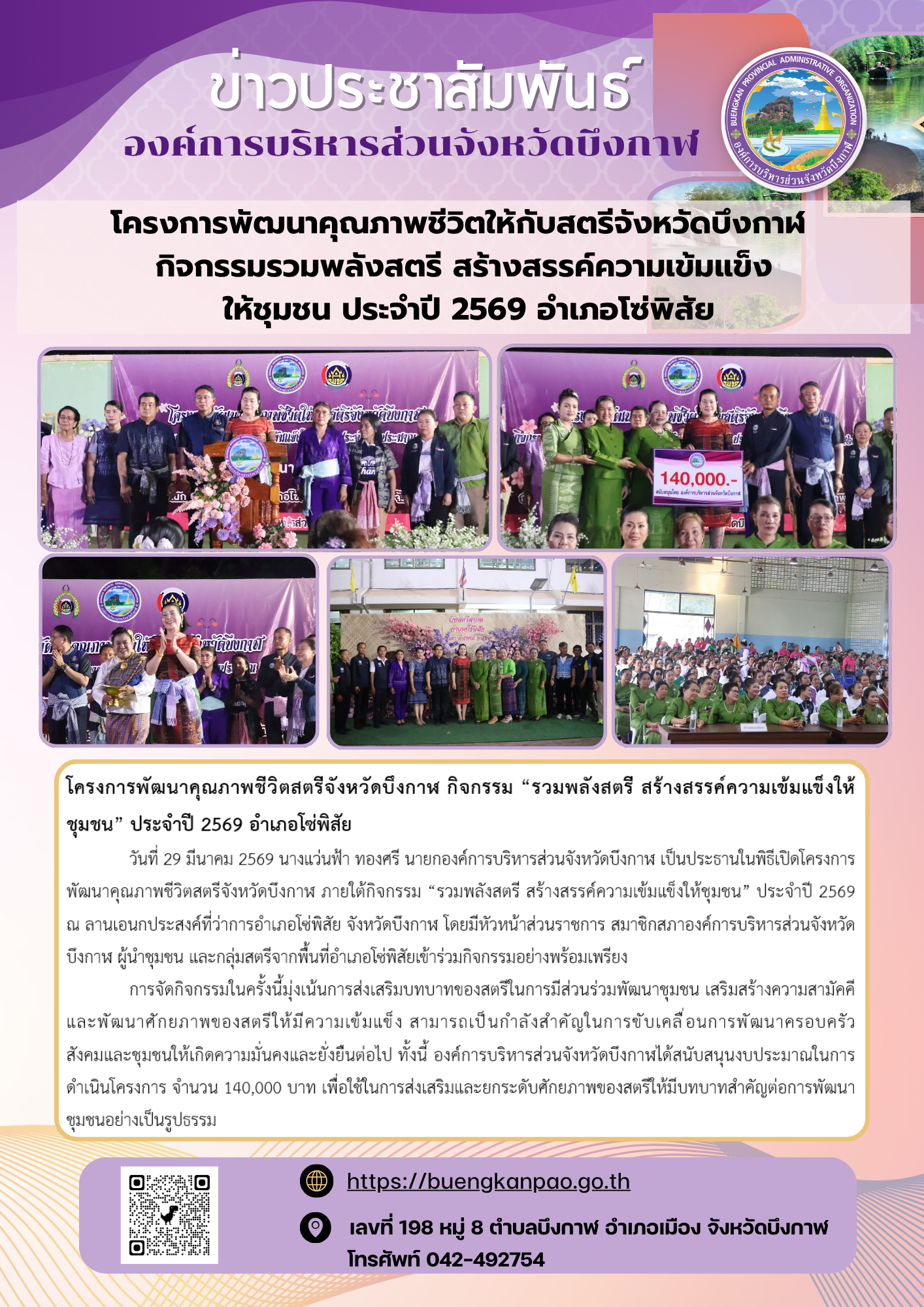 โครงการพัฒนาคุณภาพชีวิตสตรีจังหวัดบึงกาฬ กิจกรรม “รวมพลังสตรี สร้างสรรค์ความเข้มแข็งให้ชุมชน” ประจำปี 2569 อำเภอโซ่พิสัย