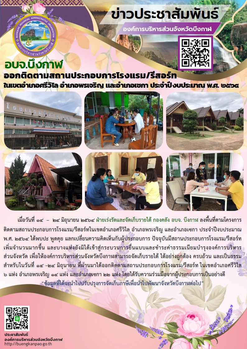 อบจ.บึงกาฬ ออกติดตามสถานประกอบการโรงแรม/รีสอร์ทในเขตอำเภอศรีวิไล อำเภอพรเจริญ และอำเภอเซกา ประจำปีงบประมาณ พ.ศ. ๒๕๖๔