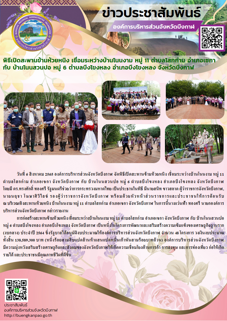 พิธีเปิดสะพานข้ามห้วยหนิง เชื่อมระหว่างบ้านโนนงาม หมู่ 11 ตำบลโสกก่าม อำเภอเซกา กับ บ้านโนนสวนปอ หมู่ 6 ตำบลบึงโขงหลง อำเภอบึงโขงหลง จังหวัดบึงกาฬ
