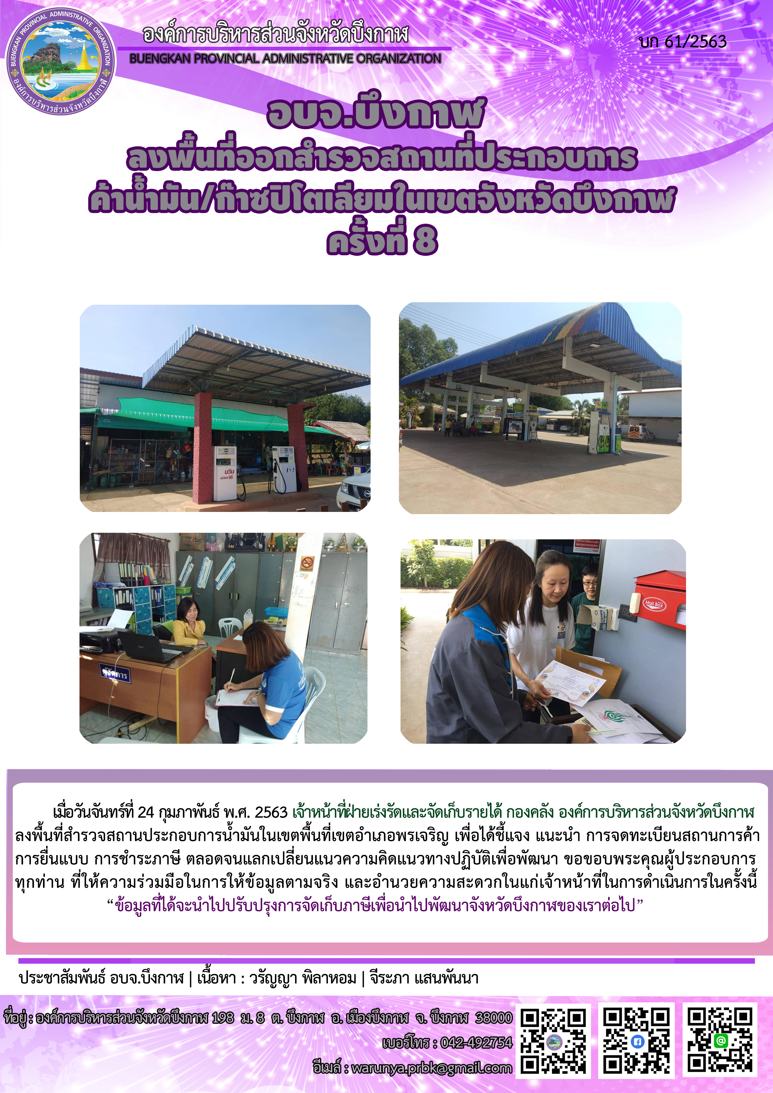 อบจ.บึงกาฬ ลงพื้นที่ออกสำรวจสถานที่ประกอบการค้าน้ำมันและก๊าซปิโตรเลียมในเขตจังหวัดบึงกาฬ ครั้งที่ 8