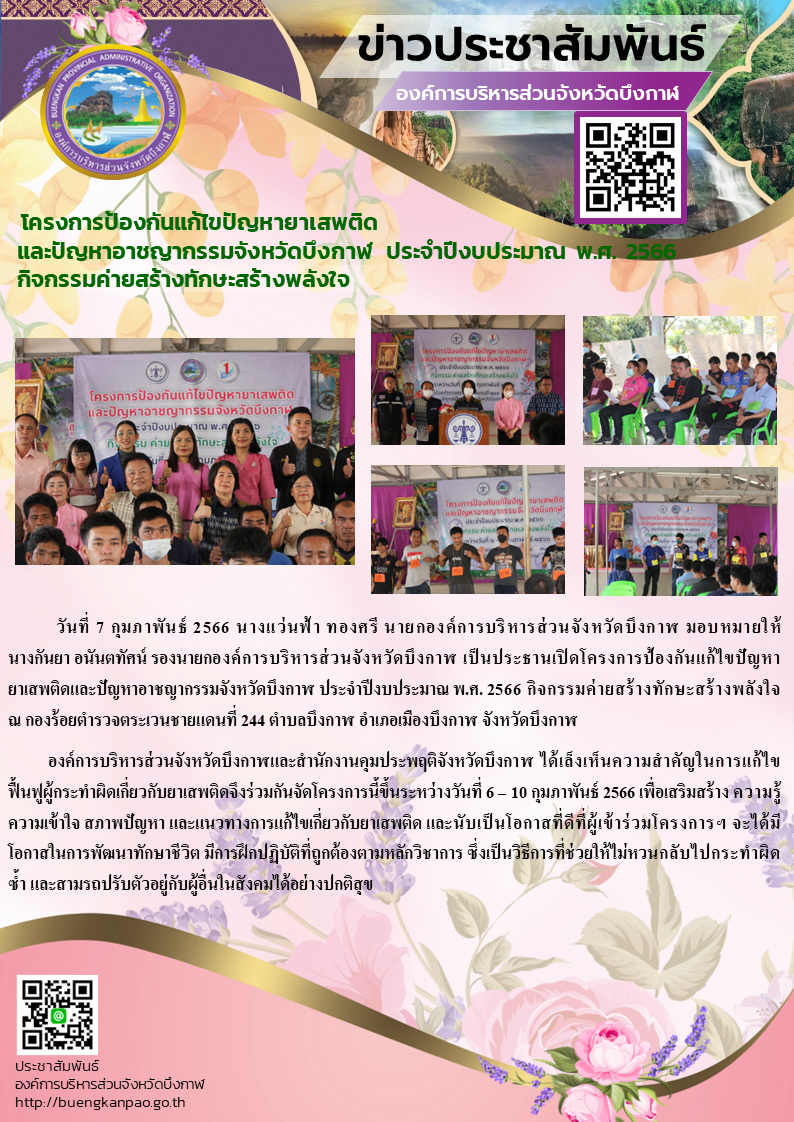 โครงการป้องกันแก้ไขปัญหายาเสพติด และปัญหาอาชญากรรมจังหวัดบึงกาฬ ประจำปีงบประมาณ พ.ศ. 2566 กิจกรรมค่ายสร้างทักษะสร้างพลังใจ