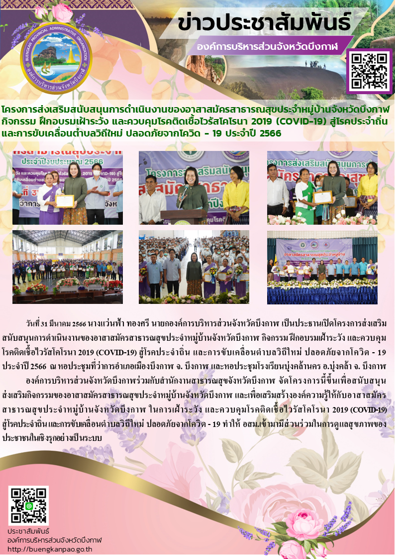 โครงการส่งเสริมสนับสนุนการดำเนินงานของอาสาสมัครสาธารณสุขประจำหมู่บ้านจังหวัดบึงกาฬ กิจกรรม ฝึกอบรมเฝ้าระวัง และควบคุมโรคติดเชื้อไวรัสโคโรนา 2019 (COVID-19) สู่โรคประจำถิ่น และการขับเคลื่อนตำบลวิถีใหม่ ปลอดภัยจากโควิด - 19 ประจำปี 2566