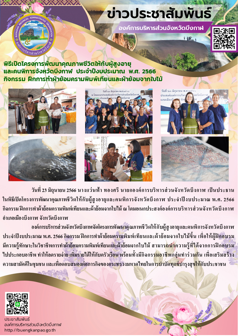 พิธีเปิดโครงการพัฒนาคุณภาพชีวิตให้กับผู้สูงอายุ และคนพิการจังหวัดบึงกาฬ ประจำปีงบประมาณ พ.ศ. 2566 กิจกรรม ฝึกการทำผ้าย้อมครามพิมพ์เทียนและผ้าย้อมจากใบไม้