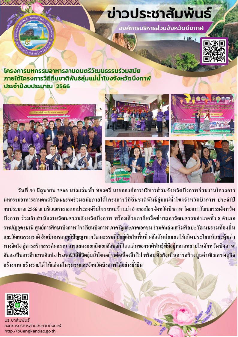 โครงการมหกรรมอาหารลานดนตรีวัฒนธรรมร่วมสมัย ภายใต้โครงการวิถีถิ่นชาติพันธ์ลุ่มแม่น้ำโขงจังหวัดบึงกาฬ ประจำปีงบประมาณ 2566