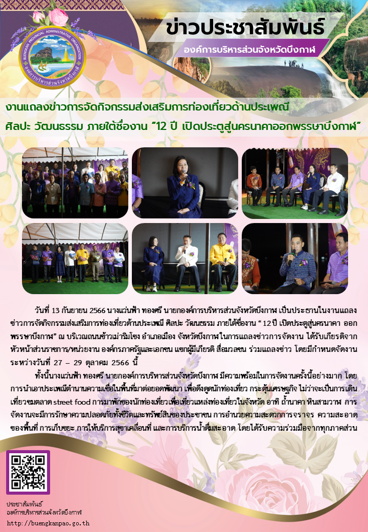 งานแถลงข่าวการจัดกิจกรรมส่งเสริมการท่องเที่ยวด้านประเพณี ศิลปะ วัฒนธรรม ภายใต้ชื่องาน “12 ปี เปิดประตูสู่นครนาคา ออกพรรษาบึงกาฬ”