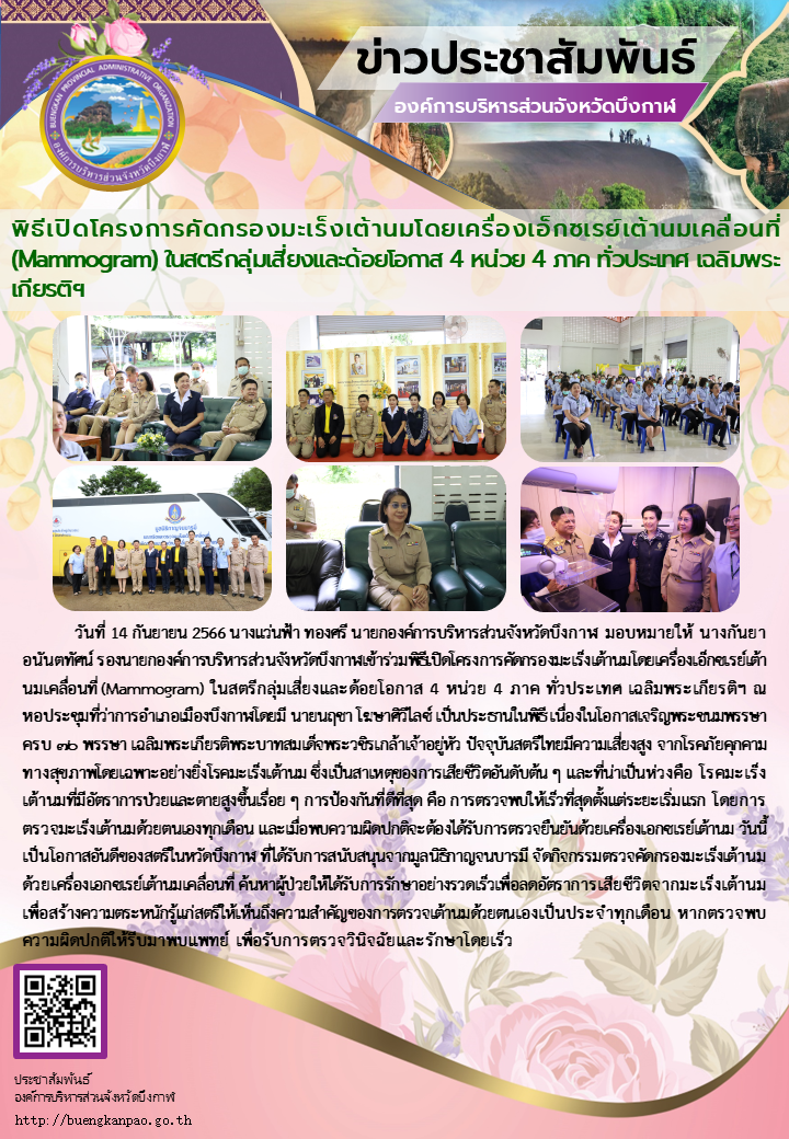 พิธีเปิดโครงการคัดกรองมะเร็งเต้านมโดยเครื่องเอ็กซเรย์เต้านมเคลื่อนที่ (Mammogram) ในสตรีกลุ่มเสี่ยงและด้อยโอกาส 4 หน่วย 4 ภาค ทั่วประเทศ เฉลิมพระเกียรติฯ