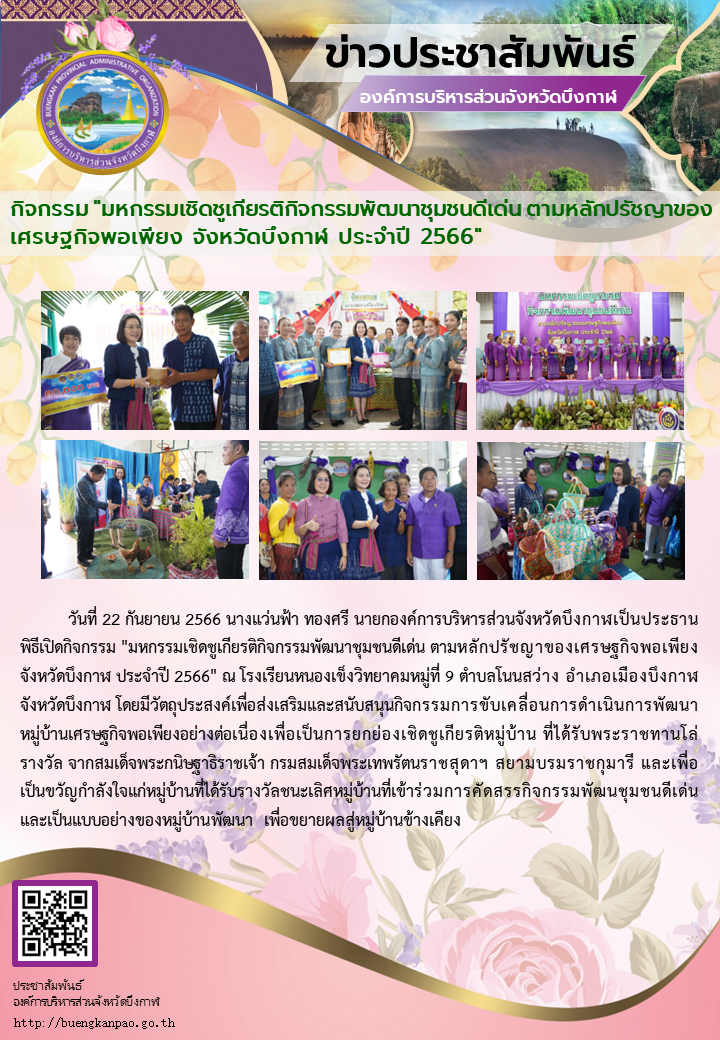 กิจกรรม "มหกรรมเชิดชูเกียรติกิจกรรมพัฒนาชุมชนดีเด่น ตามหลักปรัชญาของเศรษฐกิจพอเพียง จังหวัดบึงกาฬ ประจำปี 2566"