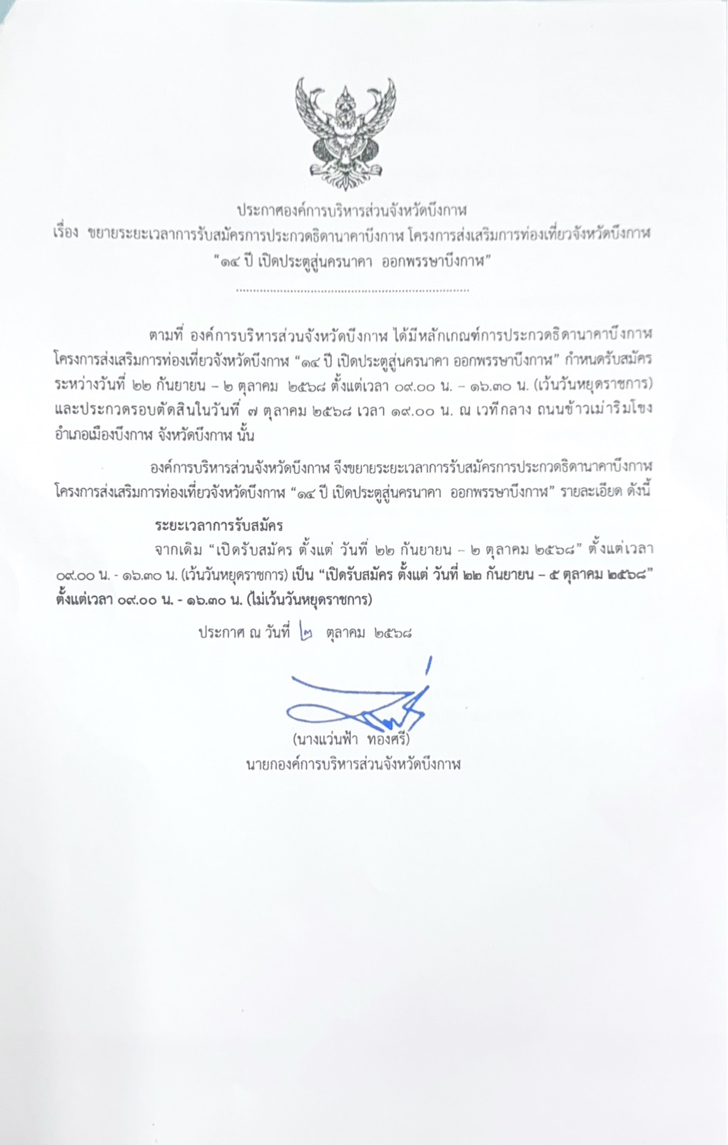 ขยายระยะเวลาการรับสมัครการประกวดธิดานาคาบึงกาฬ โครงการส่งเสริมการท่องเที่ยวจังหวัดบึงกาฬ “๑๔ปี เปิดประตูสู่นครนาคา ออกพรรษาบึงกาฬ”