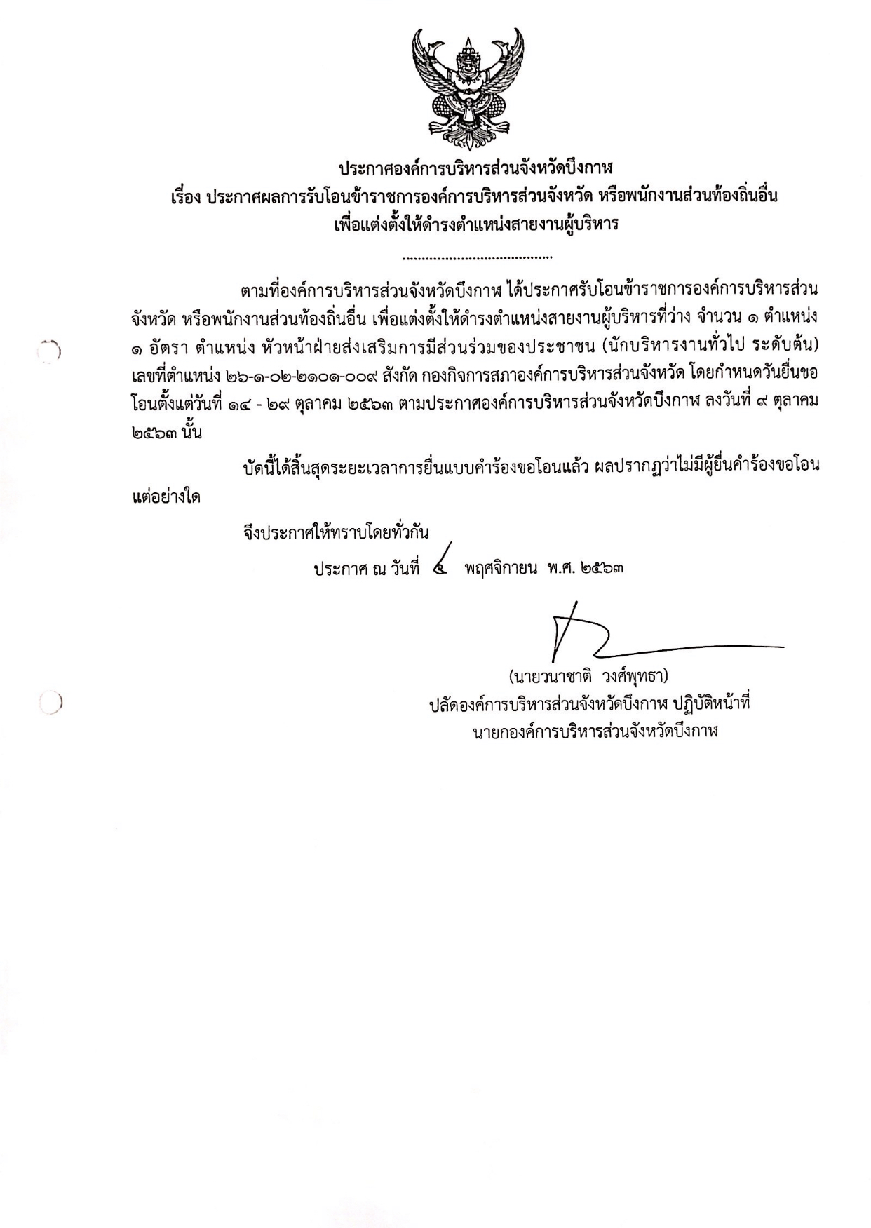 ประกาศผลการรับโอนข้าราชการองค์การบริหารส่วนจังหวัดบึงกาฬ หรือพนักงานส่วนท้องถิ่นอื่นเพื่อแต่งตั้งให้ดำรงตำแหน่งสายงานผู้บริหาร