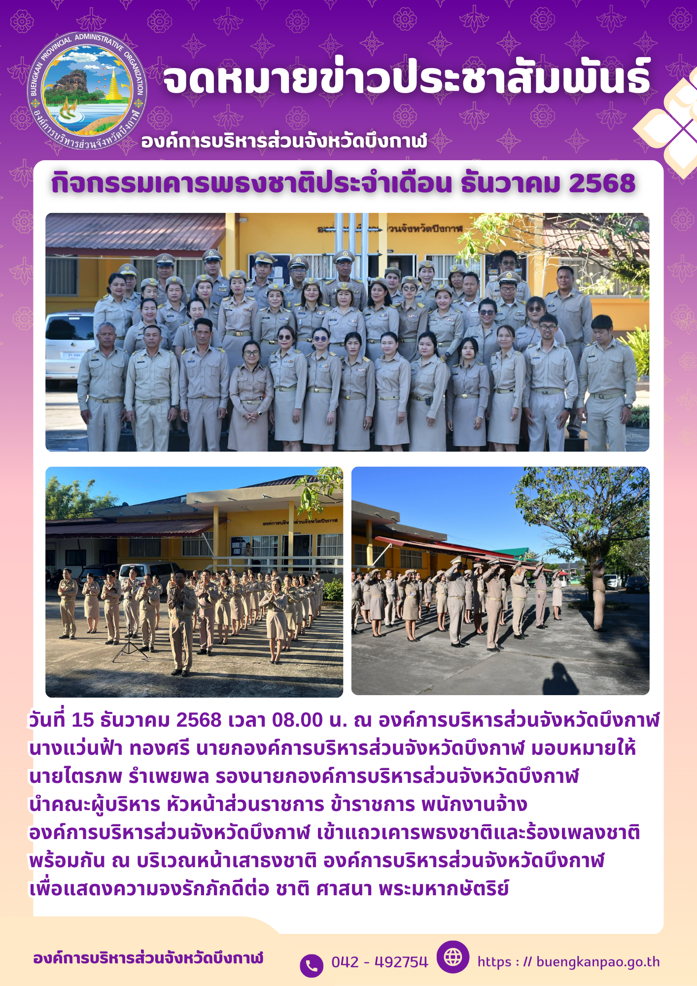 องค์การบริหารส่วนจังหวัดบึงกาฬ จัดกิจกรรมเคารพธงชาติประจำเดือน ธันวาคม 2568