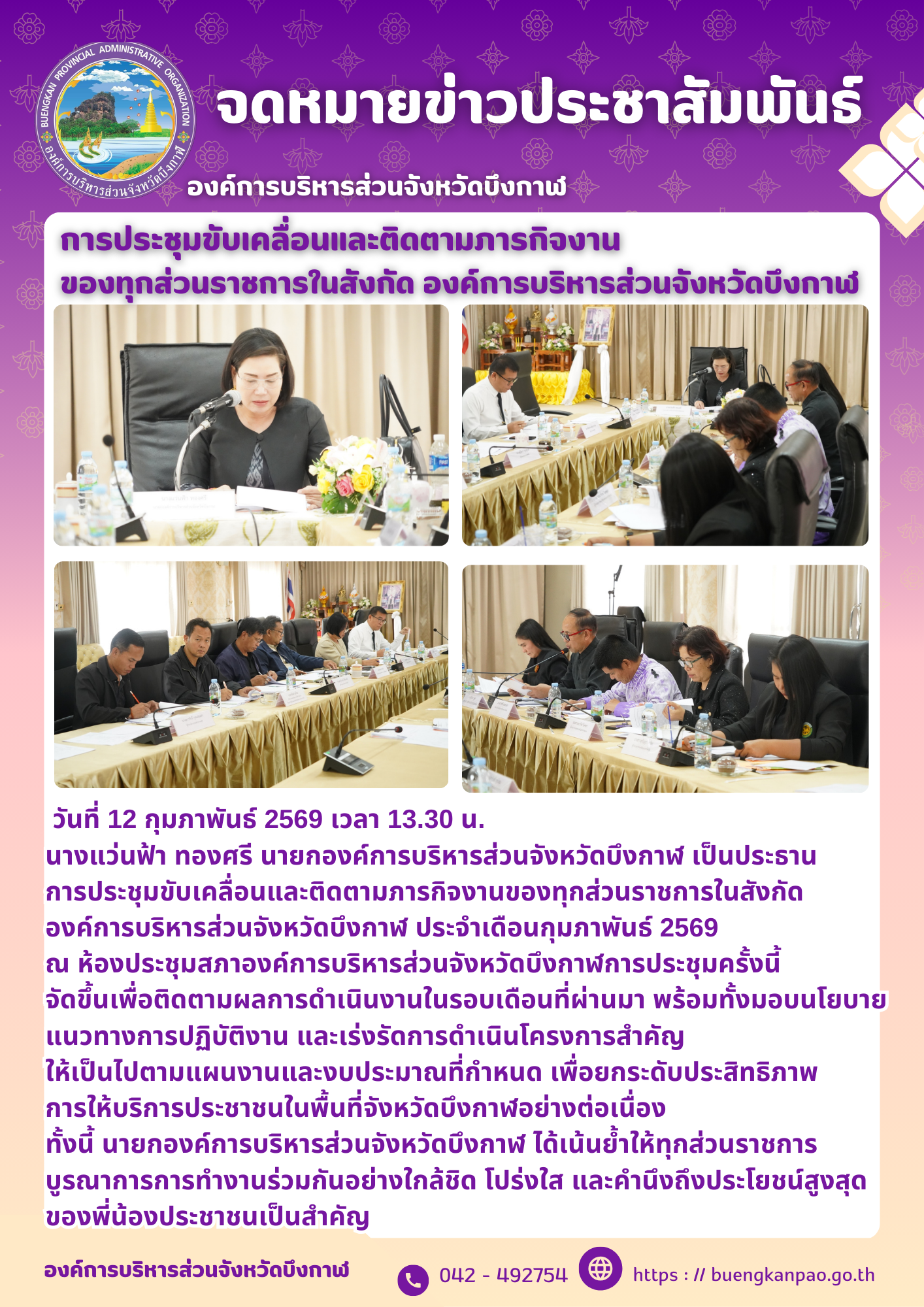 ประชุมขับเคลื่อนและติดตามภารกิจงานของทุกส่วนราชการในสังกัด องค์การบริหารส่วนจังหวัดบึงกาฬ ประจำเดือนกุมภาพันธ์ 2569