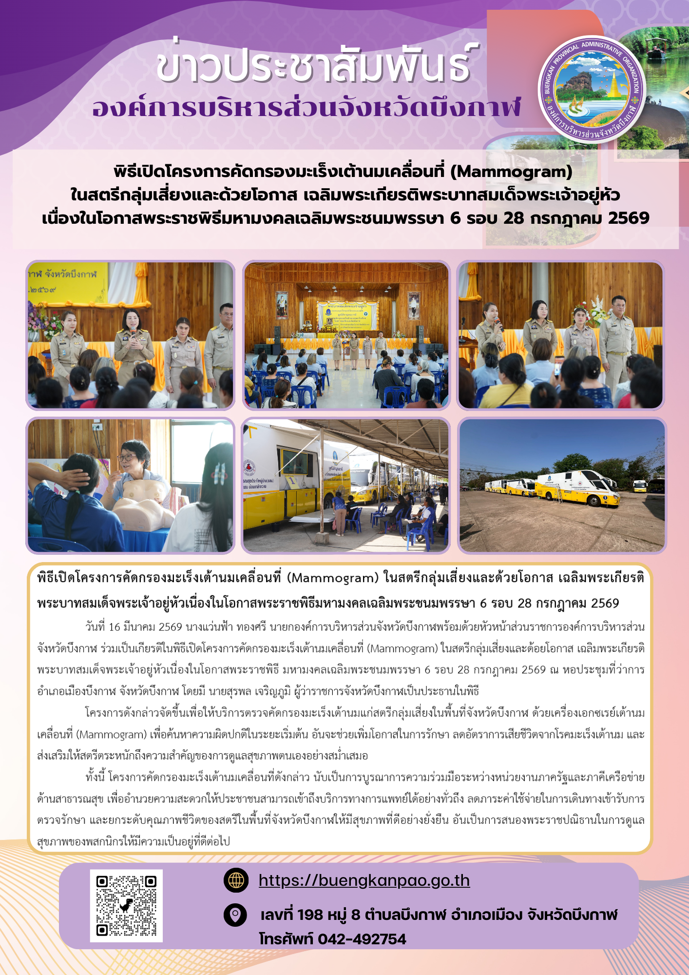 พิธีเปิดโครงการคัดกรองมะเร็งเต้านมเคลื่อนที่ (Mammogram) ในสตรีกลุ่มเสี่ยงและด้อยโอกาส เฉลิมพระเกียรติพระบาทสมเด็จพระเจ้าอยู่หัวเนื่องในโอกาสพระราชพิธีมหามงคลเฉลิมพระชนมพรรษา 6 รอบ 28 กรกฎาคม 2569