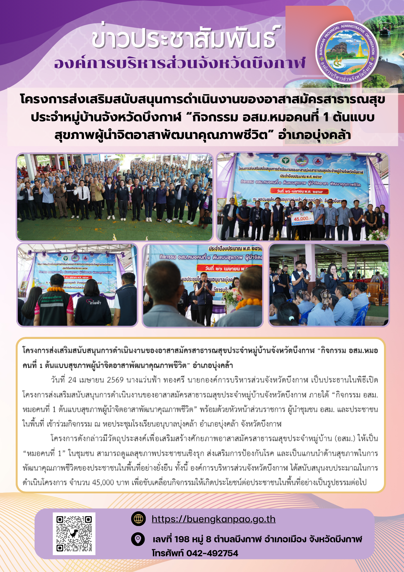 โครงการส่งเสริมสนับสนุนการดำเนินงานของอาสาสมัครสาธารณสุขประจำหมู่บ้านจังหวัดบึงกาฬ “กิจกรรม อสม.หมอคนที่ 1 ต้นแบบสุขภาพผู้นำจิตอาสาพัฒนาคุณภาพชีวิต” อำเภอบุ่งคล้า