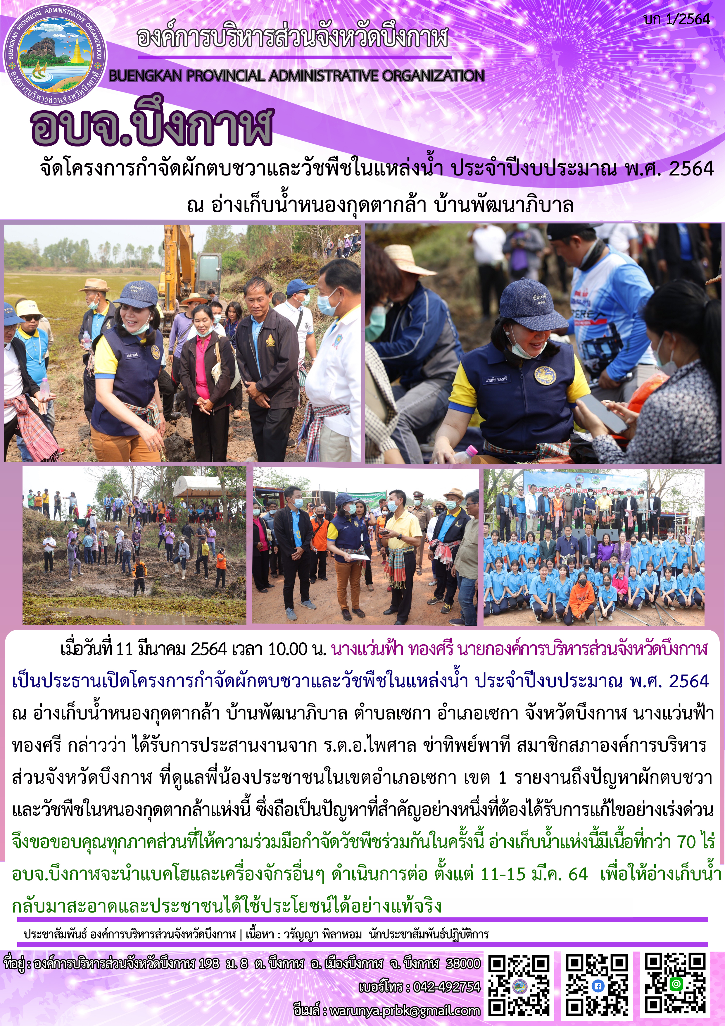 อบจ.บึงกาฬ จัดโครงการกำจัดผักตบชวาและวัชพืชในแหล่งน้ำ ประจำปีงบประมาณ พ.ศ. 2564 ณ อ่างเก็บน้ำหนองกุดตากล้า บ้านพัฒนาภิบาล
