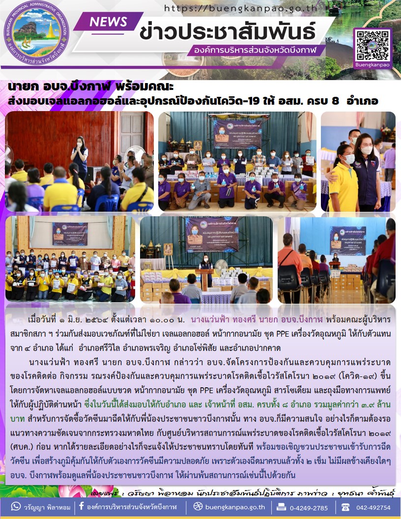 นายก อบจ.บึงกาฬ พร้อมคณะส่งมอบเจลแอลกอฮอล์และอุปกรณ์ป้องกันโควิด-19 ให้ อสม. ครบ ๘ อำเภอ