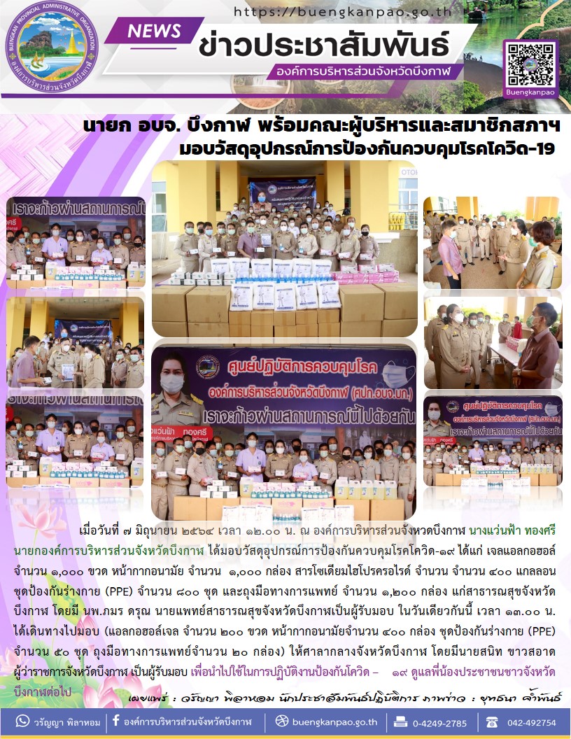 นายก อบจ. บึงกาฬ พร้อมคณะผู้บริหารและสมาชิกสภาฯ มอบวัสดุอุปกรณ์การป้องกันควบคุมโรคโควิด-19