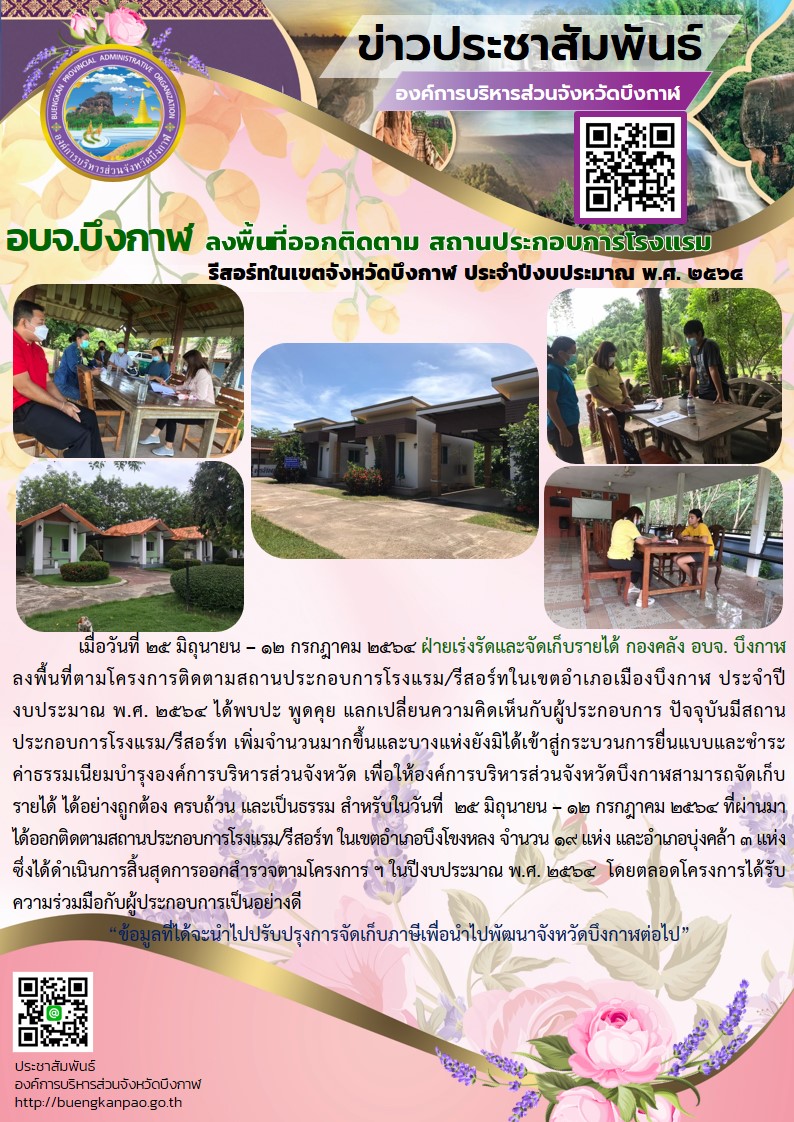 อบจ.บึงกาฬ ลงพื้นที่ออกติดตามสถานประกอบการโรงแรม รีสอร์ทในเขตจังหวัดบึงกาฬ ประจำปีงบประมาณ พ.ศ. 2564