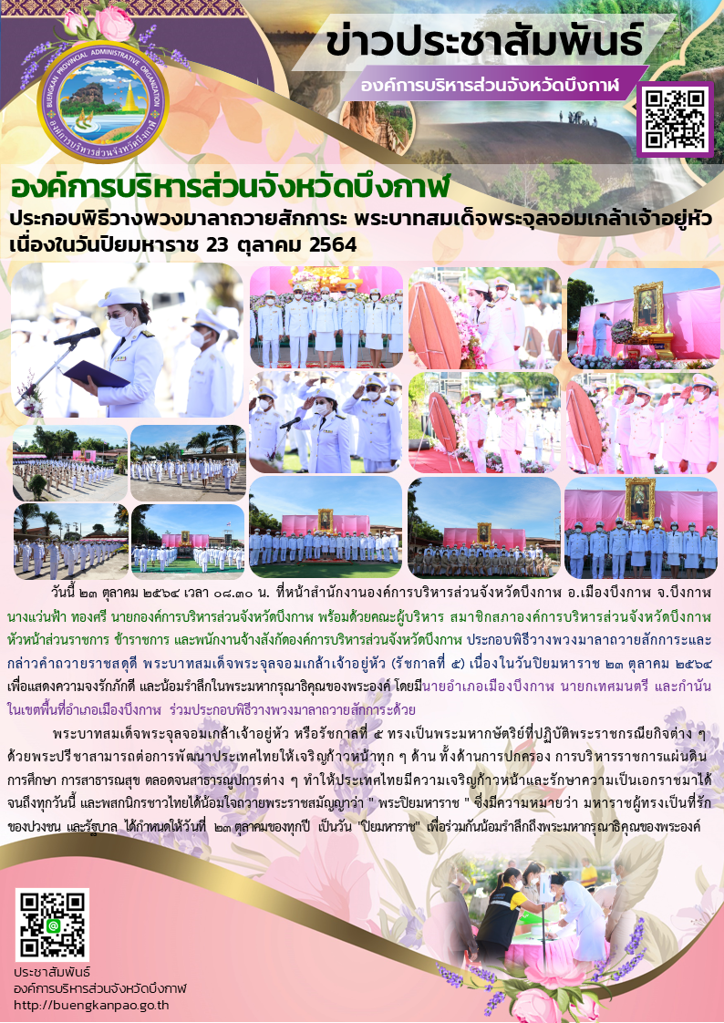 องค์การบริหารส่วนจังหวัดบึงกาฬ ประกอบพิธีวางพวงมาลาถวายสักการะ พระบาทสมเด็จพระจุลจอมเกล้าเจ้าอยู่หัว เนื่องในวันปิยมหาราช 23 ตุลาคม 2564
