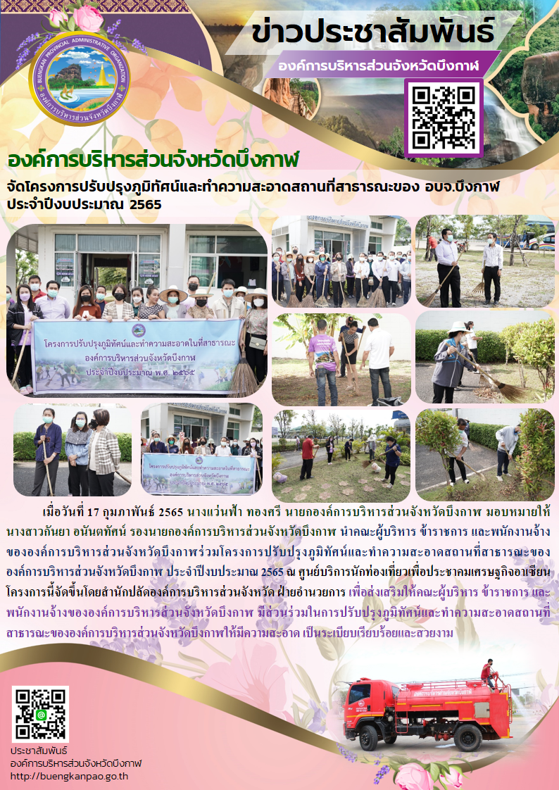 องค์การบริหารส่วนจังหวัดบึงกาฬจัดโครงการปรับปรุงภูมิทัศน์และทำความสะอาดสถานที่สาธารณะของ อบจ.บึงกาฬ ประจำปีงบประมาณ 2565