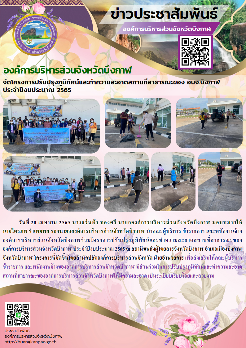 องค์การบริหารส่วนจังหวัดบึงกาฬ จัดโครงการปรับปรุงภูมิทัศน์และทำความสะอาดสถานที่สาธารณะของ อบจ.บึงกาฬ ประจำปีงบประมาณ 2565